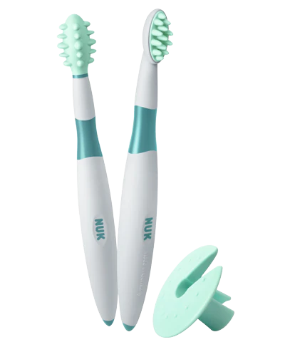 The NUK Training Toothbrush Set is ideal for introducing your child to teeth cleaning step-by-step. The Brush-and-Bite Teething Trainer gently massages specific areas of the gums and the roof of the mouth and helps to relieve the pressure from teething. The soft, bite-resistant rubber tips of the Brushing Trainer gently clean the first visible, little teeth. Your child learns the right movement for cleaning teeth at the same time.